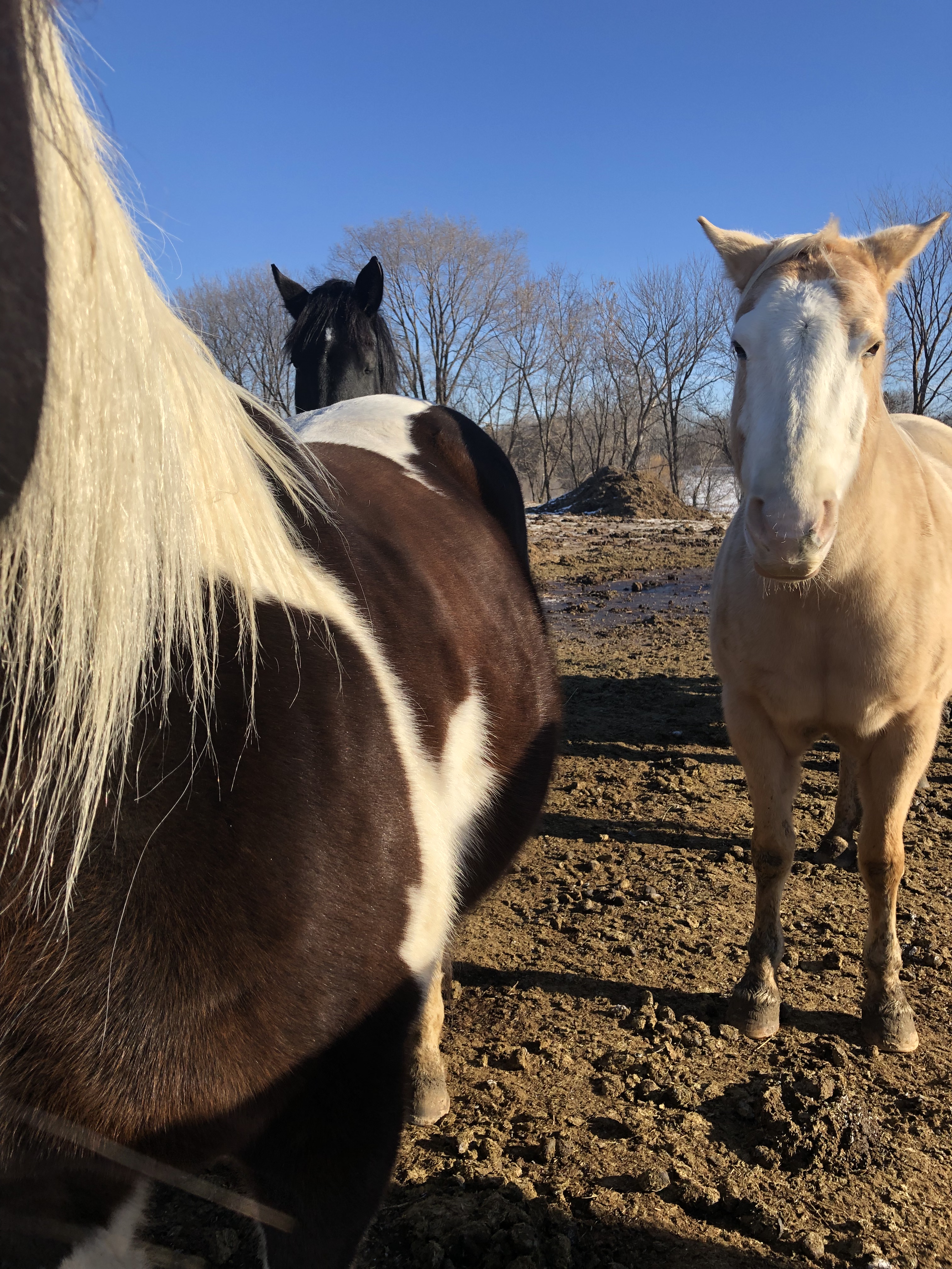 It is cold, bitterly cold, the kind of cold that freezes your eyelashes and makes breathing, walking, and chores painfully exhausting. We find ourselves wanting to rush, to hurry and get things done so we can get inside. The snow is starting to fall, walking is a struggle and we fluctuate between slipping on the ice or plowing through the snow. I’ve got my scarf pulled up over my nose and my hat pulled down as low as I can without covering my eyes. Hearing and seeing have become a struggle, a battle of either staying warm or sacrificing my senses. I’m desperate for warmth, for coffee, or soup, anything warm. I see all the horses waiting to be fed and I want to cry because each footstep is an effort. It’s overwhelming to know that we need to be out here for hours to get chores finished, and that I must come back out again to tackle night chores. Joanie and Kristin are with me, we’ve stopped talking to each other because it takes too much effort and too much time.